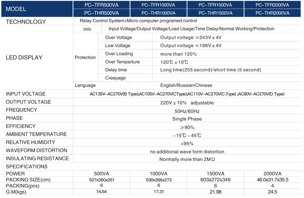 PC-TFR500VA PC-TFR1000VA PC-TFR1500VA PC-TFR2000VA 1.Wall Mount Relay control voltage stabilizer 2.Input voltage 140-270V,105-270V,90-270V,80V-270V 3.LED Digital display 4.Low voltage protection (ouput voltage <185V+/-5V), Over voltage protection (output voltage >245v+/-5v),over loading >110%,over heating >100℃