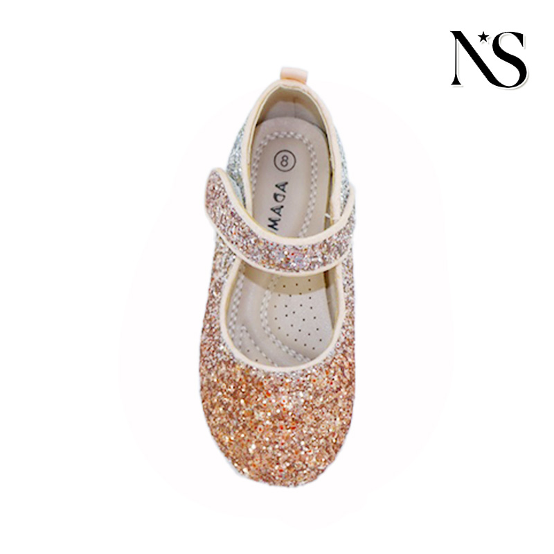 These are a pair of dazzling glittery Mary Jane shoes designed for children. They feature a classic round - toe design, which not only gives the shoes a timeless charm but also ensures that kids' toes have enough space to move comfortably. The entire upper is covered with sparkling glitter, creating a stunning and eye - catching effect that's sure to make any child feel like a star. A single strap with glitter detailing crosses the instep. This strap not only keeps the shoes securely on the feet but is also easy for kids to put on and take off by themselves. Inside the shoes, there are breathable perforations that help keep feet dry and comfortable, even during active play. The brand name "MADA" is visible on the insole, indicating a certain level of quality. Mary Jane shoes have long been associated with a sense of elegance and whimsy, making them a popular choice for various occasions, from daily wear to special events like parties or performances. These glittery ones, wi…