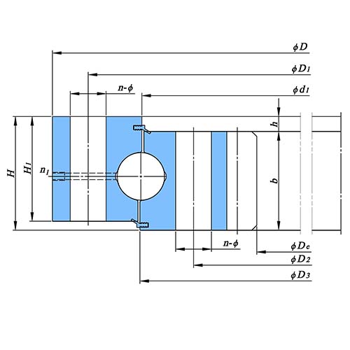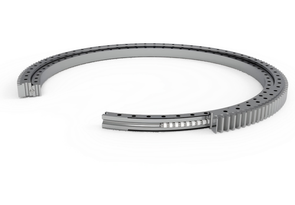 Four-point contact slewing bearings with teeth on the inner ring play an indispensable role in the mechanical field. It has a unique structure, with the inner ring, outer ring, steel balls and isolation blocks being the main components. The inner ring is machined with teeth to facilitate meshing with the pinion of the driving device, realizing direct power transmission and effectively simplifying the equipment transmission system. The steel balls are in four-point contact with the arc raceways of the inner and outer rings, which gives the bearing a strong load-bearing capacity and can withstand axial force, radial force and overturning moment at the same time. During operation, the bearing evenly distributes the load through four-point contact to ensure high-precision operation; the inner ring teeth work closely with the pinion, and convert the driving force into smooth rotation based on the gear meshing principle.The bearings are widely used in construction machinery such as cranes an…