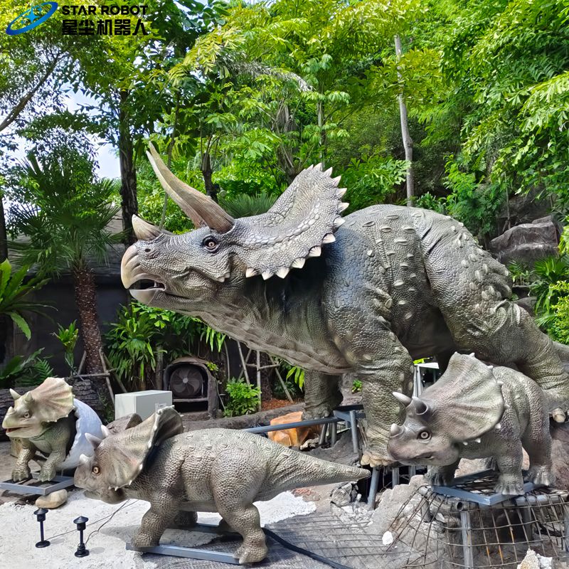 The Realistic Animatronic Triceratops Family, featuring a 5.7-meter-long mother, two lively 2-meter-long cubs, and a 1.3-meter-long baby hatching from its shell, perfectly recreates the life of a Triceratops family from the Cretaceous period. As a signature exhibit of the theme park, the Animatronic Triceratops Family, surrounded by lush greenery, offers visitors an unprecedented immersive experience. The mother Triceratops Models utilizes a state-of-the-art servo motor system, enabling eight lifelike movements: head panning, nodding, roaring, head rotation, eyes blinking, tail swaying, abdominal breathing, and forward and backward body movement. As it roars heavenward, the texture on its frill trembles with movement, each detail evoking the majesty of the Triceratops. The two cubs in the Realistic Triceratops are equally lifelike, their heads precisely reproduced using 3D-printed technology. They can move their heads up and down, rotate, spin, and wag their tails.…